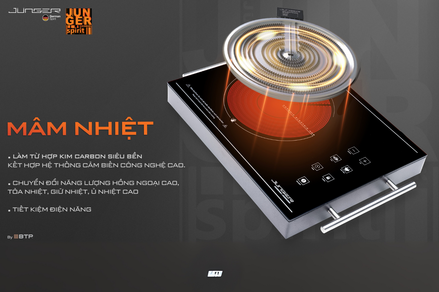 Junger ASC-86 được trang bị mâm nhiệt Hi-Light hợp kim Carbon, giúp sinh nhiệt nhanh, ổn định và tương thích với hầu hết các loại nồi chảo. Cấu tạo bền chắc, chịu nhiệt cao mang lại hiệu suất nấu nướng tối ưu, rút ngắn thời gian chế biến nhưng vẫn đảm bảo chất lượng món ăn.