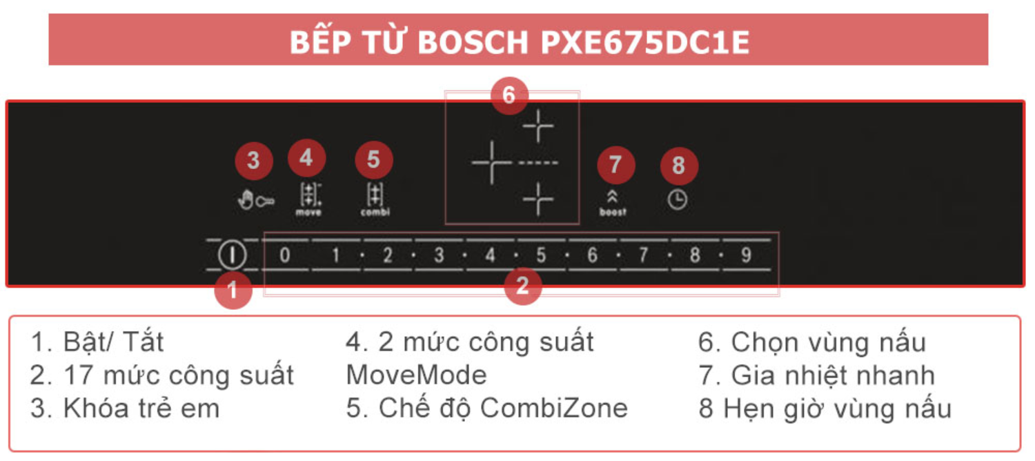 Chức năng CombiZone kết nối hai vùng nấu nhỏ bên phải thành một vùng nấu lớn Chức năng PowerBoost giúp tăng công suất lên mức tối đa trong thời gian ngắn Chức năng MoveMode thiết lập hai mức công suất khác nhau trên vùng nấu đa điểm, dễ chuyển qua lại giữa chiên và giữ ấm Hẹn giờ tắt độc lập từng vùng Chức năng QuickStart giúp bếp tự động nhận diện nồi và khởi động nhanh chóng ReStart giúp khôi phục cài đặt khi có sự cố |