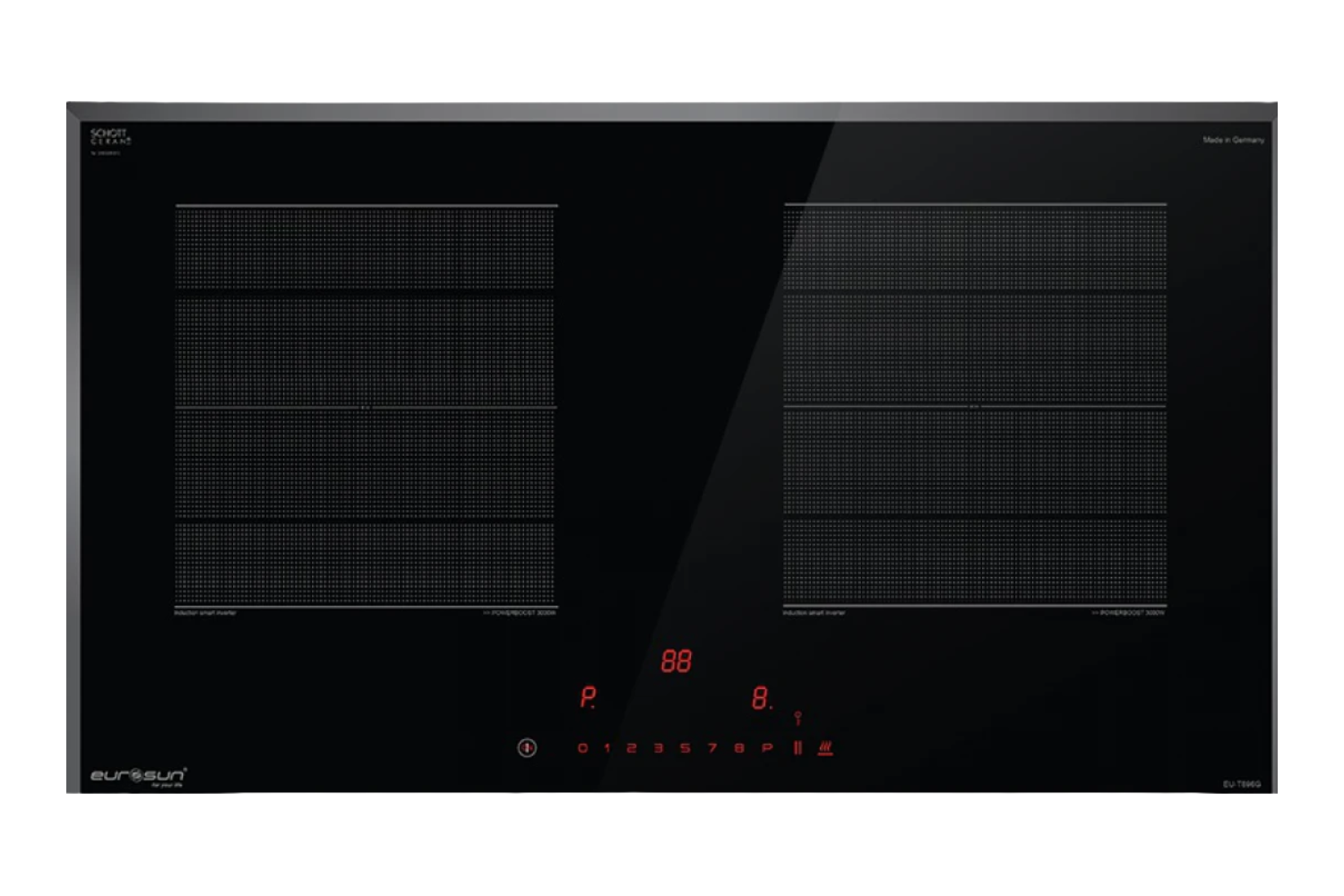 Eurosun EU-T896G được trang bị mặt kính Schott Ceran cao cấp, nhập khẩu trực tiếp từ Đức – thương hiệu kính gốm thủy tinh số 1 thế giới, nổi tiếng trong ngành thiết bị nhà bếp. Loại kính này mang đến nhiều ưu điểm vượt trội:
