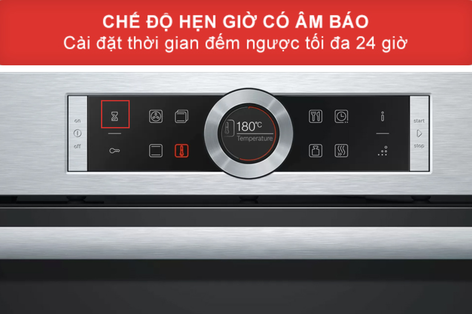 - Chức năng hẹn giờ và tự động tắt: Với chức năng này, bạn có thể hẹn giờ bắt đầu và kết thúc quá trình nướng một cách chính xác. Khi món ăn đã chín, lò sẽ tự động tắt và phát ra âm thanh báo hiệu. Điều này không chỉ đảm bảo an toàn, tránh tình trạng món ăn bị cháy khét mà còn giúp bạn chủ động hơn trong việc quản lý thời gian.