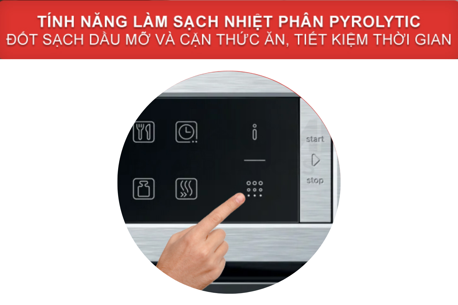Đối với vết bẩn cứng đầu, dầu mỡ và cặn vụn thức ăn tích tụ nhiều, chế độ làm sạch nhiệt phân Pyrolytic sẽ loại bỏ hoàn toàn mà không cần sử dụng bất kỳ chất tẩy rửa hóa học nào. Lò sẽ tự động đẩy nhiệt độ lên đến 480°C, biến mọi vết bẩn thành tro. Sau khi chu trình kết thúc và lò nguội, bạn chỉ cần dùng khăn mềm lau sạch phần tro còn lại. Lò cung cấp 3 cấp độ Pyrolytic (cấp 1, 2, 3) tùy thuộc vào mức độ bẩn của khoang lò. Cấp độ cao nhất sẽ giúp "khử khuẩn tốt hơn" và làm sạch triệt để.