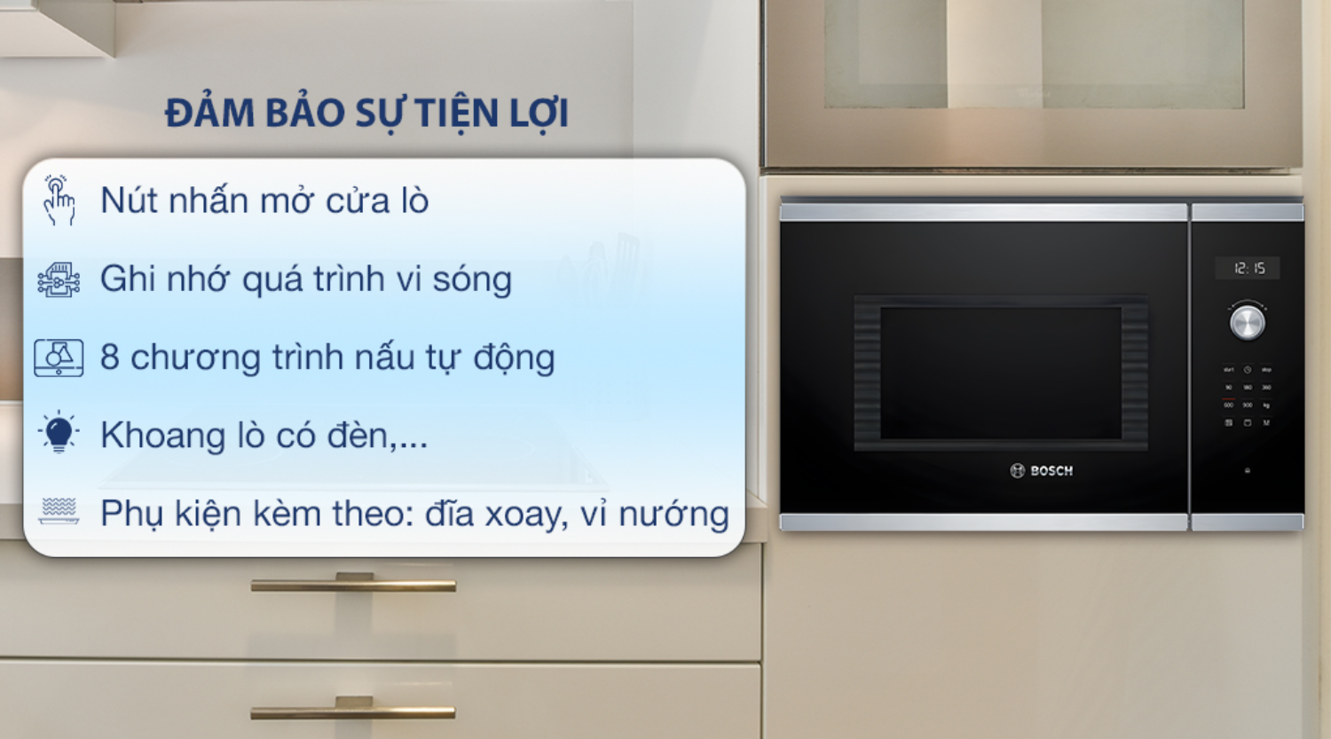 Lò vi sóng âm tủ Bosch BEL554MB0 Serie 6 là một giải pháp toàn diện cho căn bếp hiện đại, đáp ứng đầy đủ các tiêu chí về thiết kế, công năng và sự tiện lợi. Với vẻ ngoài sang trọng, khả năng lắp đặt âm tủ tối ưu không gian, dung tích 25 lít phù hợp cho gia đình nhỏ, cùng các tính năng nổi bật như 5 cấp độ vi sóng, chức năng nướng, chương trình AutoPilot 8 thông minh và chế độ hẹn giờ linh hoạt, sản phẩm này chắc chắn sẽ mang lại trải nghiệm nấu nướng hiệu quả, an toàn và đầy cảm hứng cho mọi gia đình. Đây là một khoản đầu tư xứng đáng để nâng tầm không gian bếp của bạn.