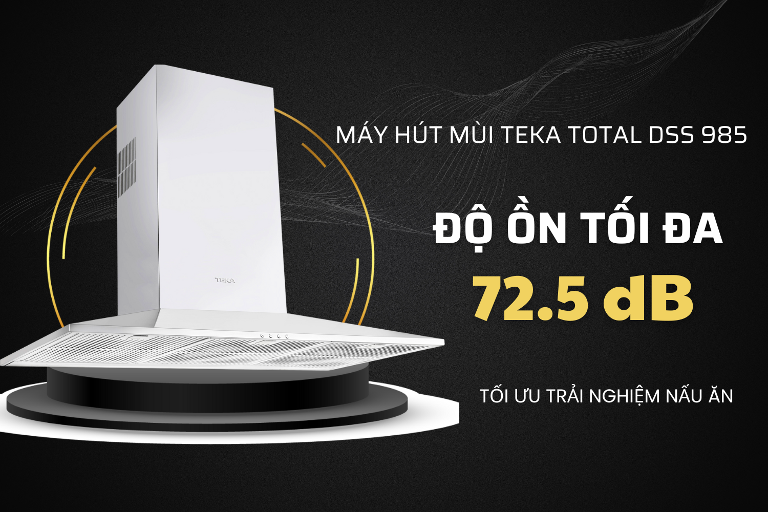 Với nhiều hộ gia đình, vấn đề tiếng ồn là mối quan tâm lớn. Tuy nhiên, Teka TOTAL DSS 985 đã giải quyết bài toán đó rõ ràng với cấu trúc cách âm, động cơ EcoPower tối ưu luồng khí, giúp máy vận hành êm ái. Ở công suất thấp, máy chỉ phát ra âm thanh khoảng 53,7 dB – tương đương giọng nói bình thường khi trò chuyện. Ở mức hút trung bình, âm thanh đạt khoảng 65–70 dB, vẫn trong mức cho phép để dùng bên cạnh người nói chuyện mà không bị làm phiền. Ngay cả khi kích hoạt Booster để xử lý mùi mạnh, âm lượng chỉ lên đến khoảng 72,5 dB – vẫn thấp hơn nhiều so với mức âm thanh của máy hút mùi công nghiệp hoặc quạt hút mạnh.